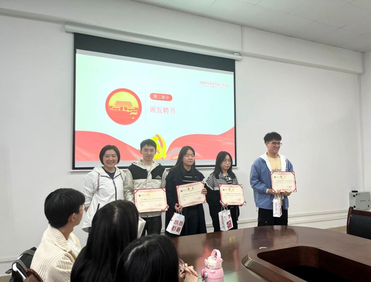 太阳成集团tyc234cc学生党务工作站指导老师王燕晶为上一届工作站成员颁发聘书并合影留念。