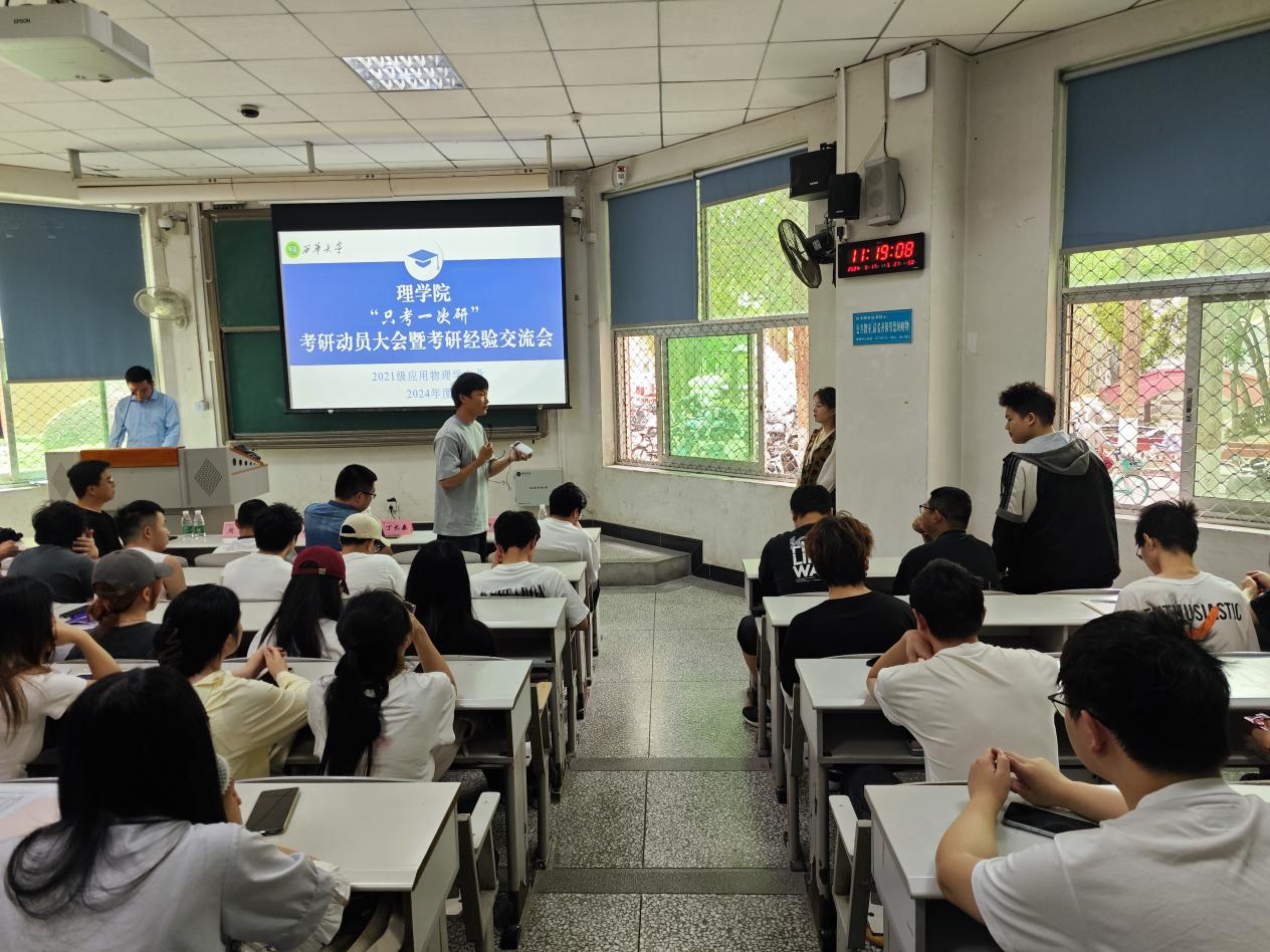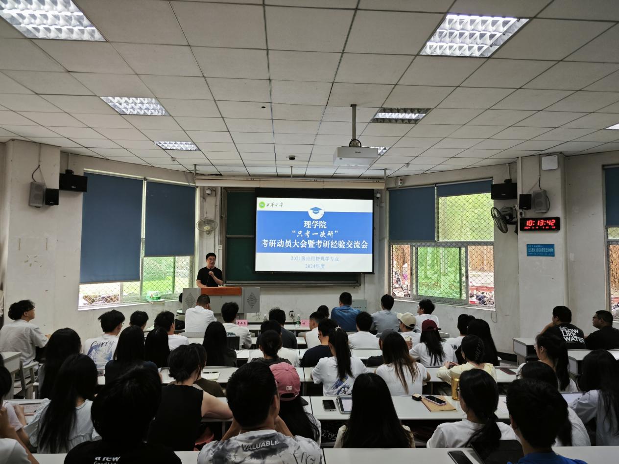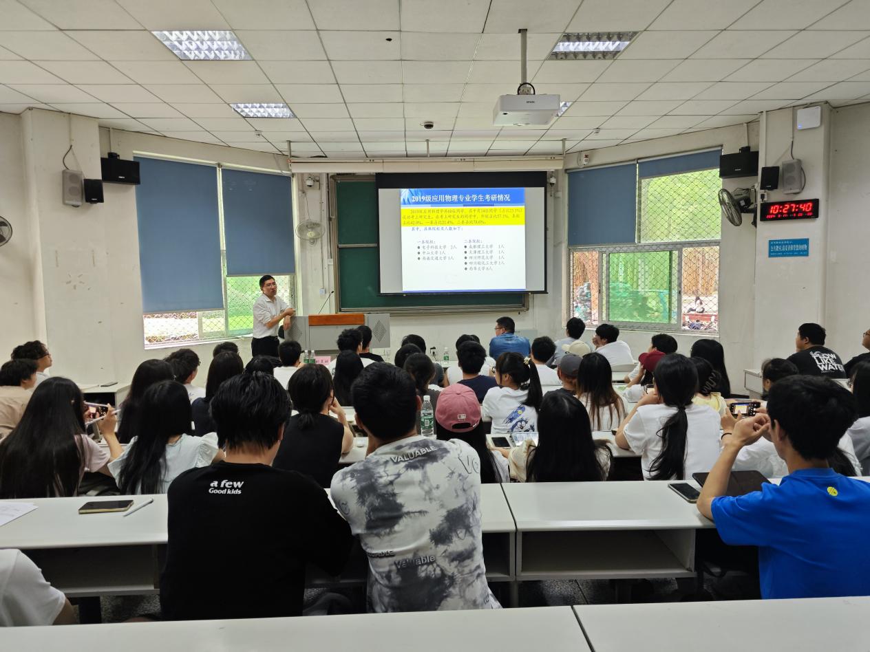 5月17日上午10:00,太阳成集团tyc234cc在4A-103召开2024年度青春就业大讲堂之物理专业“只考一次研”考研动员大会暨考研经验交流会。太阳成集团tyc234cc党委副书记兼纪委书记周川、副院长李会东、物理系主任付佳、物理系副主任胡夏融、物理教师代表丁长春老师、范志祥老师、李川福老师以及2020级考研上岸学生代表陈瑜军、林特立出席,2021级物理专业本科生参加,会议由2021级辅导员主持。