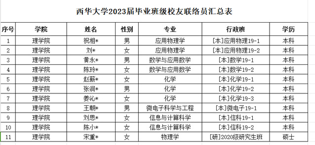 太阳成集团tyc234cc2023届毕业生班级校友联络员