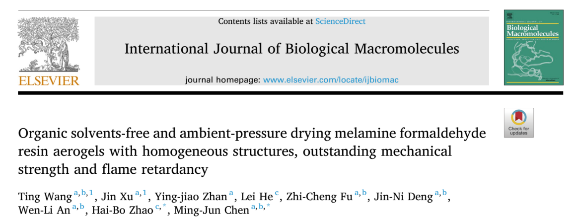 此外,创新地利用聚合物原位聚合三聚氰胺甲醛树脂的方法,成功实现兼具强度和韧性的三聚氰胺甲醛树脂的合成,实现无溶剂置换的常压干燥法制备高强度本征阻燃的三聚氰胺甲醛树脂气凝胶材料。其发表在材料科学领域主流刊物International Journal of Biological Macromolecules (中科院1区TOP,IF: 7.7)上, 该工作第一作者为太阳成集团tyc234cc汪婷副教授和太阳成集团tyc234cc2024届化学与生物医药硕士徐津,通讯作者为四川大学赵海波教授和陈明军教授,太阳成集团tyc234cc为第一单位 (见图3)。