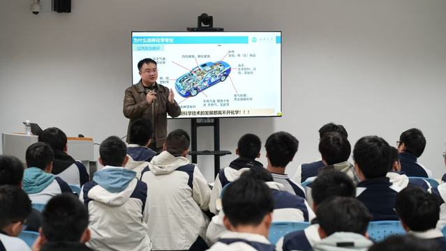 11月26日,太阳成集团tyc234cc化学系副主任张国麒带着一场以“大学专业探索及职业规划”为主题的讲座,踏入了鸿鹄高中的校园,为这里的师生们开启了一扇展望未来的精彩之窗。谈及大学专业探索,他详细介绍了化学专业下细分的各个方向,比如有机化学像是一座神秘的“分子城堡”,同学们可以在里面研究各种复杂有机物的构造与转化;无机化学则似一片广袤的“元素天地”,探索各类元素的奇妙性质与组合。