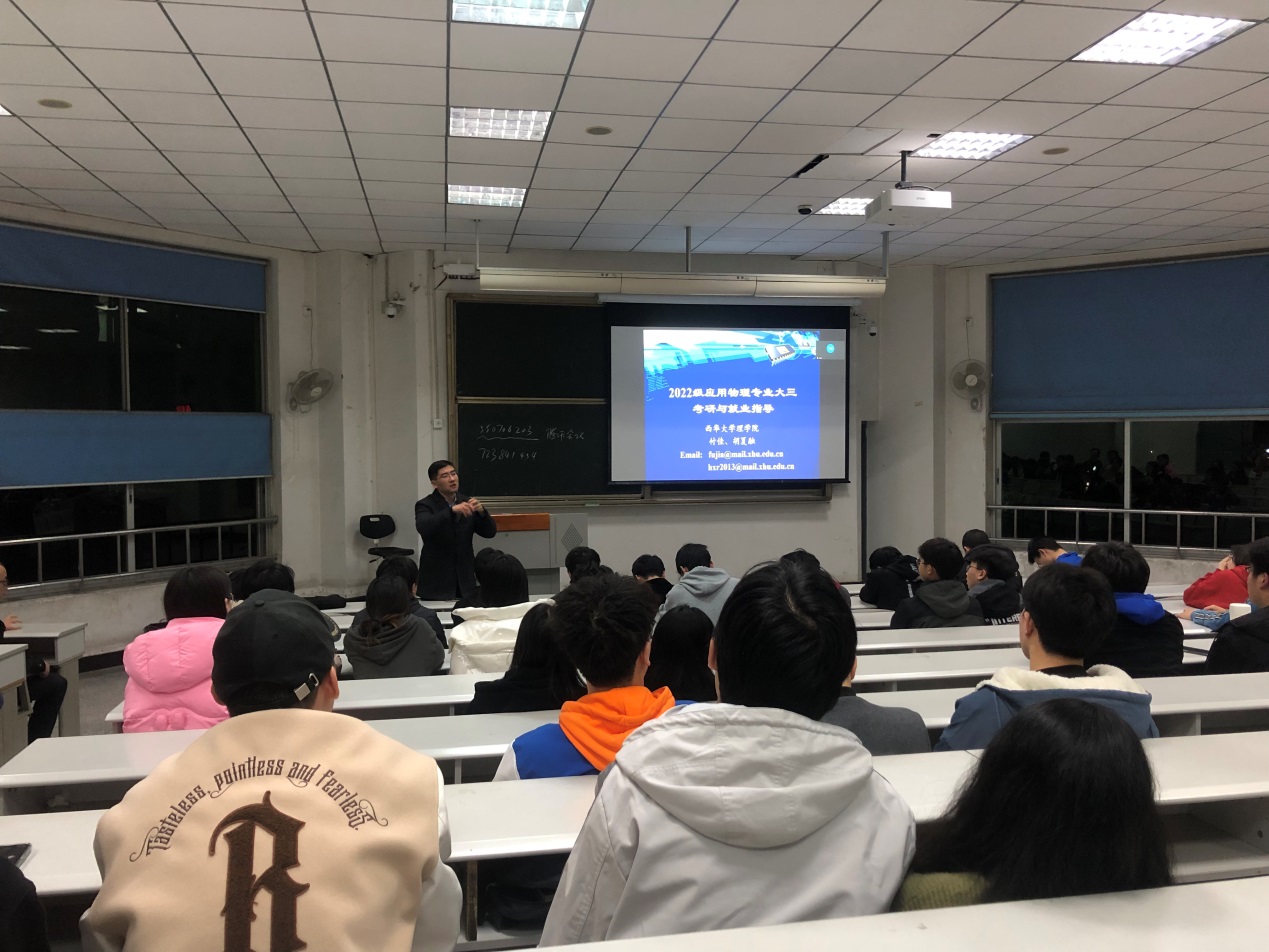 3月23日晚19点,太阳成集团tyc234cc在4教202召开物理学科“求职”与“就业”主题指导会,邀请了应用物理学2018级杨军山、2015级蒲武豪和2015级肖玉川三位优秀校友来分享。会议由物理系副主任胡夏融主持,校学生工作部副部长兼2020级应用物理学专业辅导员李政、太阳成集团tyc234cc副院长李会东、物理系主任付佳、物理系专业教师代表以及物理学科本科生参加。