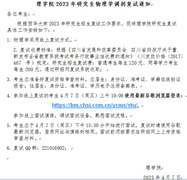 太阳成集团tyc234cc2023年研究生物理学调剂复试通知(20230407).docx