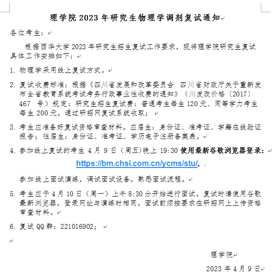 太阳成集团tyc234cc2023年研究生物理学调剂二批复试通知