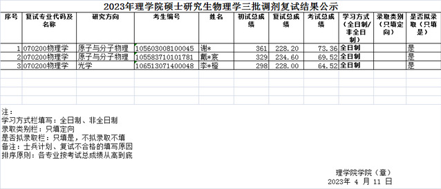 2023年太阳成集团tyc234cc硕士研究生物理学调剂复试结果公示(太阳成集团tyc234cc公示数据三批)