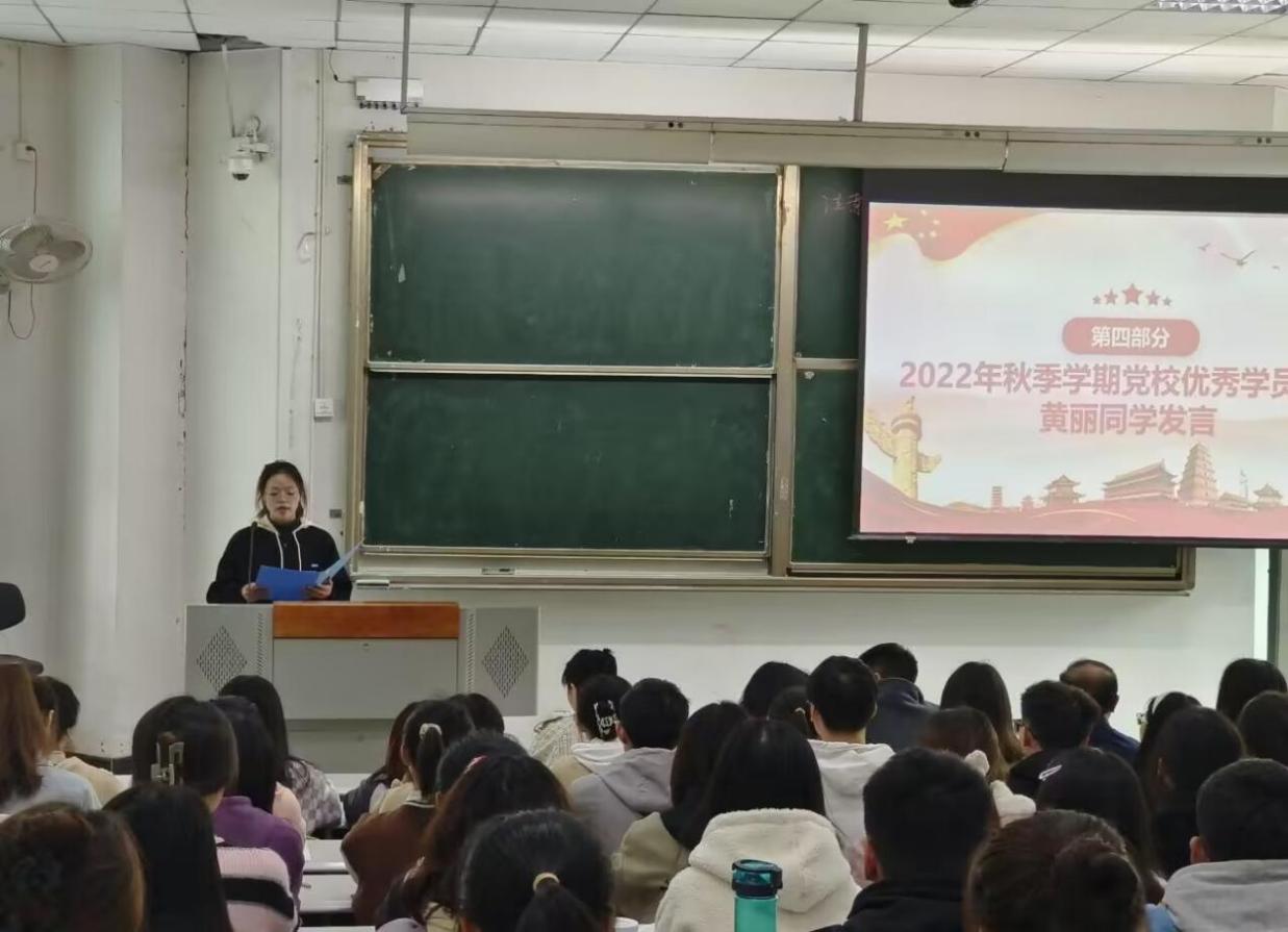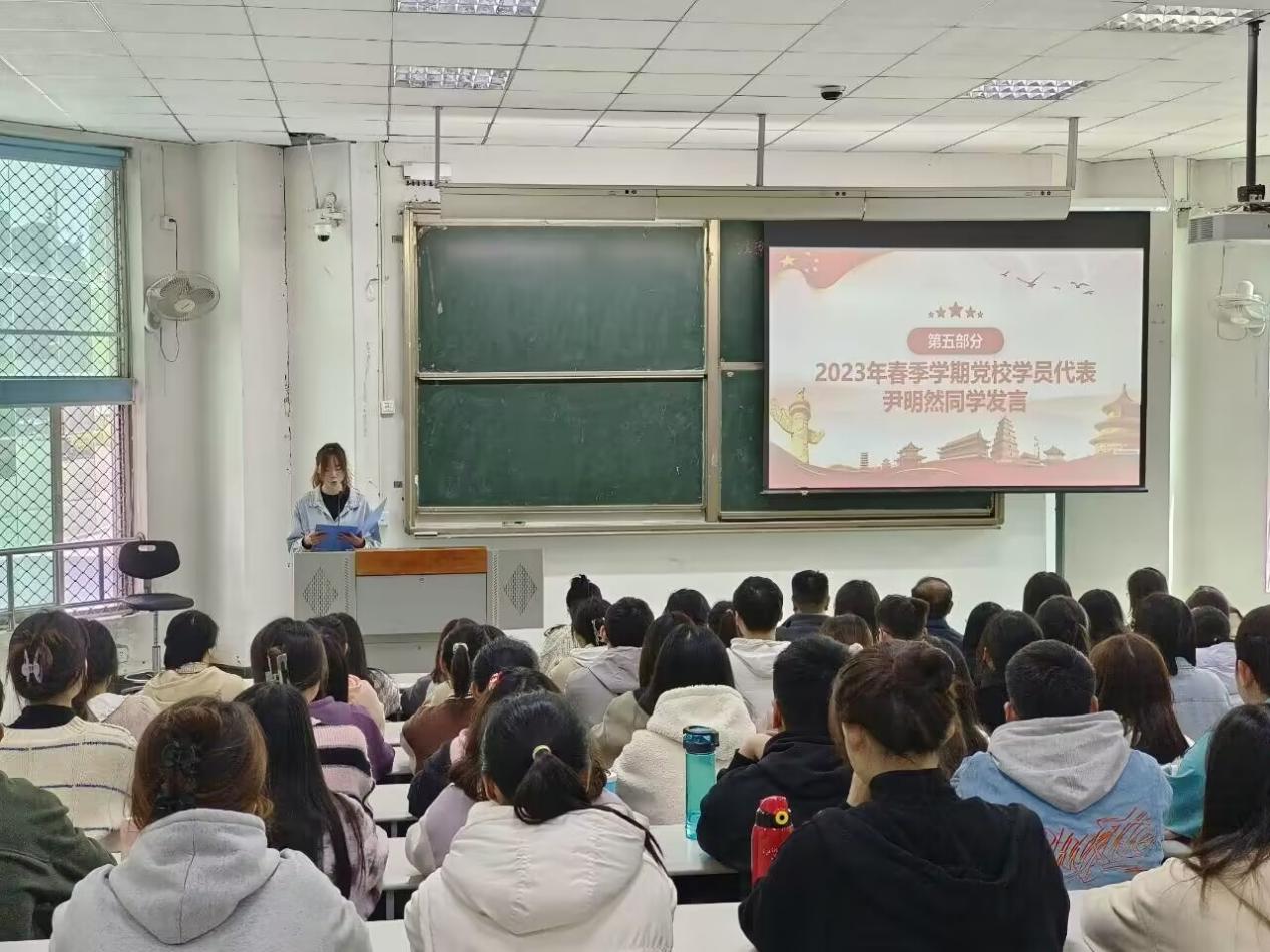 全体成员齐唱国歌后一起回顾了往期党校开展情况。2022年秋季学期党校优秀学员代表黄丽同学发言,她表示通过学习,自己的思想认识进一步提升,正在积极努力向党组织靠拢。随后,2023年春季学期党校学员代表尹明然同学发言,她表示作为入党积极分子要珍惜党校机会,要以优秀党员标准严格要求自己,要更加坚定自己的政治立场,更要保持谦虚谨慎的作风。